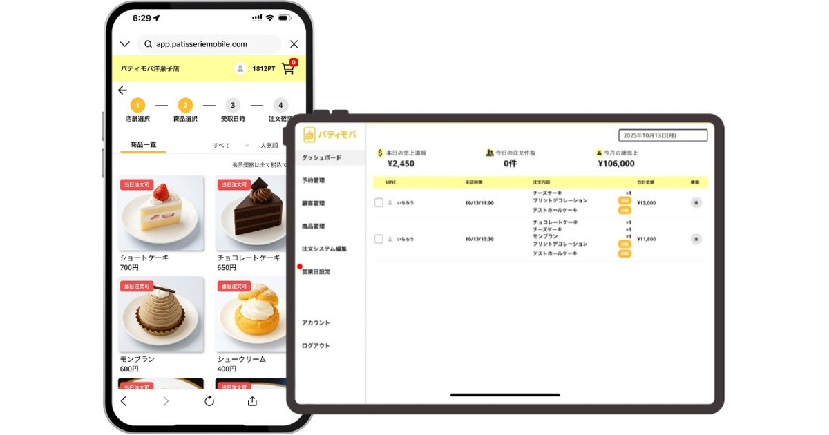 テイクアウト受付・ホールケーキ予約・焼き菓子EC・クリスマス/バレンタインなどのイベント受付まで、ひとつの管理画面で完結。複数のツールをバラバラに使う必要がありません。